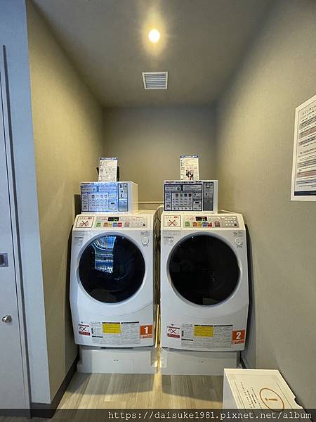 以及洗脫烘一次搞定的滾筒式洗衣機,兩三天份做一次洗,投下5個¥100硬幣 *(亦可使用電子支付) 操作簡單,可上鎖避免被誤拿。