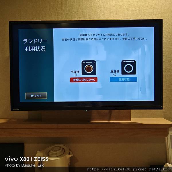 電視機可以查看洗衣機使用狀態,下樓把衣物丟進去洗,回房間休息,等時間到再下樓收衣服,洗脫烘一次搞定。